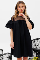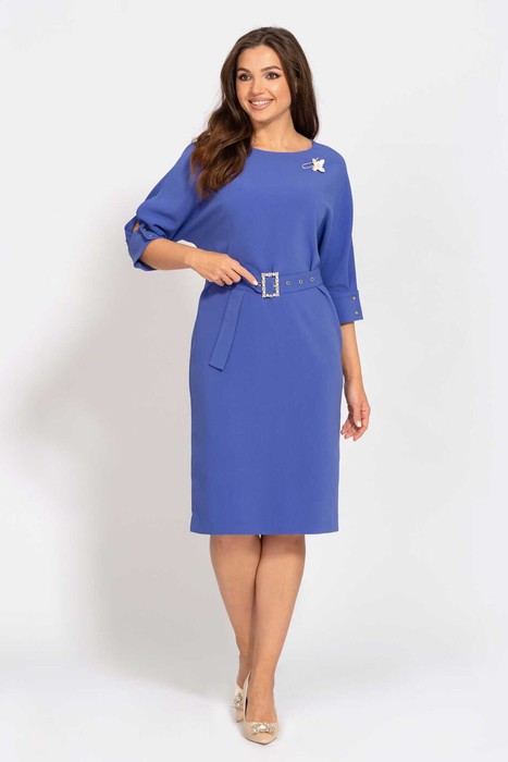 Платье женское полуприлегающего силуэта выполнено из плательной ткани. Горловина круглая. Спинка с застёжкой потайная тесьма молния в центральном шве, который заканчивается шлицей с разрезом. Рукава «летучая мышь», по низу встречные складки и манжет на застёжке две прорезные петли и пуговицы. Платье без подкладки. Дополнением служит пояс с декоративной пряжкой. Брошь в комплект не входит.