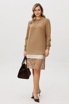 Платье трикотажное полуприлегающего силуэта, перед с фигурным подрезом, заканчивающийся разрезом. На плечевом шве заложены мягкие складки. По левому боку - небольшая сборка. Рукав втачной одношовный.