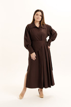 Платье полуприлегающего силуэта с рукавом реглан. Горловина переда обработана притачной планкой. Перед с вертикальными рельефами. Центральная деталь переда из отделочной ткани. Спинка с талиевыми вытачками и со средним швом. Застежка на потайную молнию.