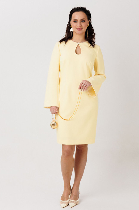 Элегантное платье-футляр, выполненное из плотной плательной ткани на подкладке. Дизайн акцентирован декоративной бейкой с жемчужным оформлением на горловине и манжетах рукавов — технически точная обработка краев, обеспечивающая долговечность и эстетику. Центральная деталь — пуговица-застежка на горловине, формирующая изысканный вырез-капель с эффектом глубины.