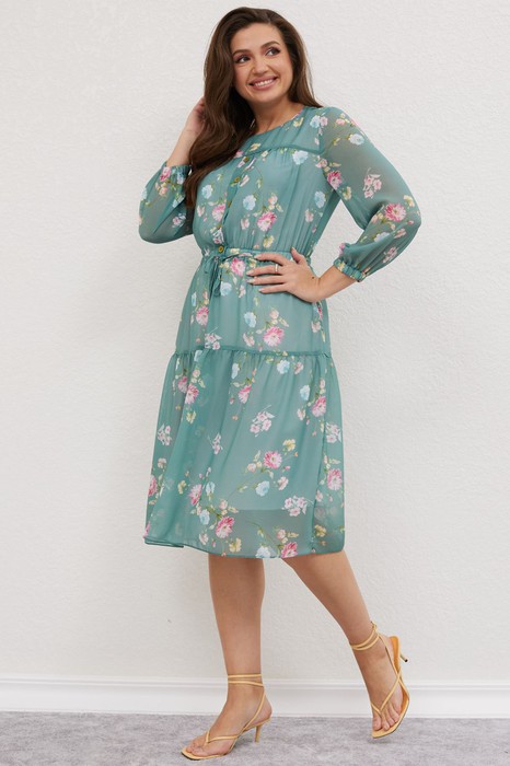 Платье женское полуприлегающего силуэта, выполнено из ткани шифон. Платье на трикотажной тонкой подкладке с широким воланом. По переду кокетка со сборкой и имитация застёжки с декоративными пуговицами. По линии талии кулиса с продетым тонким поясом с наконечниками. Спинка с центральным швом и застёжкой на воздушную петлю и пуговицу. Горловина круглая. Рукава одношовные втачные , по низу резинка.