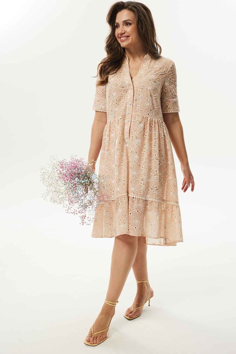 Платье женское свободного силуэта с фигурным подрезом и небольшой сборкой, по низу широкая оборка. По переду нагрудные вытачки, притачная планка и застёжка на четыре прорезные петли и пуговицы. Воротник стойка. Рукава одношовные втачные на манжете. Платье на тонкой трикотажной подкладкой. Украшает платье декоративное кружево.