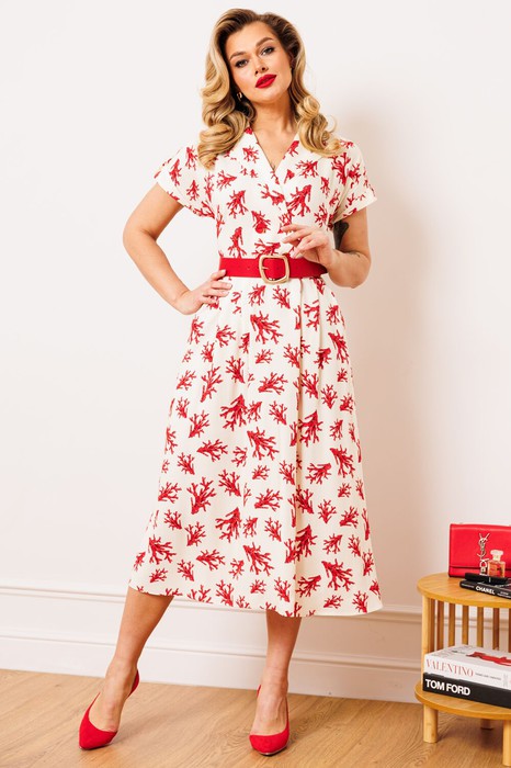 Платье женское приталенного силуэта, расширенное к низу. Платье отрезное по талии. Верхняя часть переда с нагрудными и талиевыми вытачками. По спинке - талиевые вытачки и средний шов. В среднем шве - потайная молния. Нижняя часть платья в складку. В боковых швах карманы. Рукав короткий, цельнокроенный, с манжетой и патой. Воротник пиджачного типа с имитацией застежки на 4 декоративные пуговицы. Это платье придется по душе всем, кто хочет выглядеть женственно и стильно.