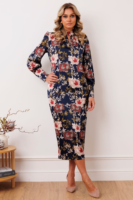 Нарядное платье из атласа - воплощение элегантности и роскоши. Полуприлегающий силуэт искусно подчеркивает изгибы фигуры. Изящный воротник-стойка добавляет строгости. От него ниспадает декоративная сборка и фигурный вырез. Рукав полуреглан с удлиненной линией плеча и сборкой по окату. Широкая манжета придает образу завершенность и усиливает акцент на деталях. Молния и высокий разрез в среднем шве. На стойке сзади застежка на две навесные петли и пуговицы. Платье идеально для вечернего выхода, свадьбы или коктейля.