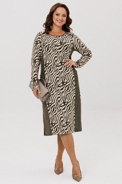Платье женское полуприлегающего силуэта, выполненное из двух видов ткани: мягкого трикотажного полотна с принтом «Зебра» и плательной ткани «Замша», которые немного тянутся. По переду и спинке отрезной бочок, накладной карман. По боковым швам низ платья со шлицами и отделочными пуговицами. По спинке средний шов. Горловина переда – «Лодочка», по спинке – округлая, переходящая в линию кокетки. Срезы горловины обработаны отделочными кантами. Рукава втачные, одношовные. Платье без подкладки.