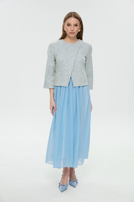 Платье макси комбинированное, двухцветное. Лиф с имитацией застёжки назапах по переду, фигурный по низу. Вырез горловины полукруглый, по спинке затежка на молнию. Рукава втачные. Юбка на резинке, драпирующаяся, расширенного силуэта из шифона. На подкладке.