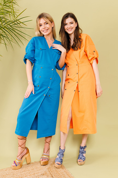 Эффектное двубортное платье длиной миди из облегчённого денима полуприлегающего силуэта. Линия плеча приспущена, рукав втачной три четверти с манжетой и патой. Горловина обработана обтачкой с  V-образным вырезом. Линия талии акцентирована притачным поясом. Имеются карманы в боковых швах. Изделие застёгивается на кнопки. Без подкладки.