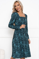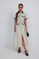 Эффектное двубортное платье длиной миди из денима полуприлегающего силуэта. Линия плеча приспущена, рукав втачной три четверти с манжетой и патой. Горловина обработана обтачкой с V-образным вырезом. Линия талии акцентирована притачным поясом. Имеются карманы в боковых швах. Изделие застёгивается на кнопки. Без подкладки.