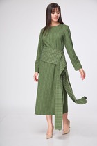 Элегантное платье, состоящее из лифа и юбки, имитирующее костюм-двойку. Лиф прямого кроя с втачным рукавом три четверти и накладными карманами. Горловина обработана рубашечным воротником с отрезной стойкой.  Юбка А-силуэта.