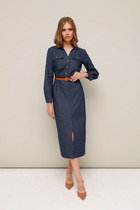 Платье длиной миди полуприлегающего силуэта отрезное по линии талии. Верхняя часть переда со средним швом и вытачкой , нагрудная вытачка объединена с талиевой вытачкой. Нижняя часть переда со средним швом и талиевыми вытачками. Вытачки верхней и нижней частей переда расположены на одной оси. Верхняя часть спинки со средним швом и талиевой вытачкой. Нижняя часть спинки со средним швом, талиевой вытачкой. Рукав втачной двухшовный. В шве по переднему перекату располагается разрез. Вырез горловины круглой формы, обработан обтачками. Застежка в среднем шве спинки на потайную тесьму-молнию. Платье декорировано тесьмой из пайеток.