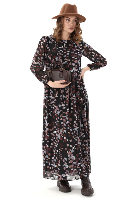 Платье макси прямого силуэта с округлым вырезом, отрезное по линии талии. Рукав немного приспущен, нижний край рукавов оформлен резинкой. Изделие на подкладке.