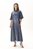 Платье комбинированное из двух тканей. Нижняя часть платья прямого силуэта, длинная , со сборкой по линии талии из отделочной ткани. Юбка на подкладке. Верхняя часть платья из основной ткани, частично на подкладке. Прямой силуэт, воротник пиджачного типа, рукав одношовный, втачной , с незначительно спущенной линией плеча, длинный, с притачной манжетой, декорированной разрезом. По линии ткани настрочная кулиса с завязками из основной ткани. Застежка центрально-бортовая на одну петлю и пуговицу функциональную и две пуговицы- имитация. Линия низа верхней части фигурная ассиметричная.