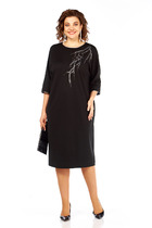 Платье прямого силуэта, состоящее из комбинации двух тканей - основной и отделочной. Воротник цельнокроеный хомут. Рукав одношовный, втачной, длинный. Нижняя юбка из отделочной ткани, со сборкой по линии талии. В виде отделки по левой части переда декоративный элемент из отделочной ткани.