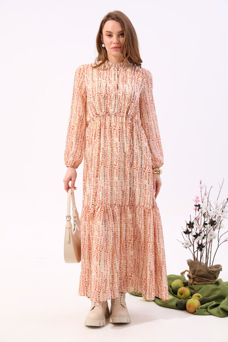 Платье прямого силуэта с отрезной завышенной линией талии по переду и на естественном уровне по спинке. Рукав длинный втачной одношовный на резинке по низу. Воротник -стойка. Верхняя часть переда с центральной застежкой на петли и пуговицы. Верхняя часть спинки с отрезной кокеткой и встречной складкой. По средней части переда и спинки настрочена кулиса, через петли которой выходит шнур для регулировки по талии. По низу платья пришит волан. Платье на подкладке.