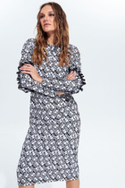 Платье макси с центральной отрезной застёжкой на потайную планку на петли и пуговицы.По переду и спинке цельнокроеные складки на уровне талии. Рукав втачной,одношовный рубашечноно типа. По низу рукава пробиты петли и вставлена завязка для фиксации сборки . Воротник рубашечный стояче отложной. В комплект к изделию идёт пояс из основной ткани для максимально комфортного регулирования объёма.