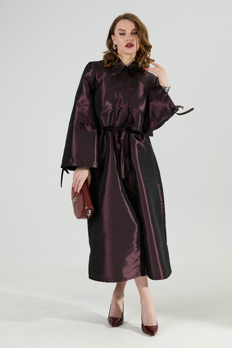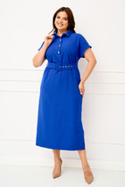 Платье макси с центральной отрезной застёжкой на центральную застежку на петли и пуговицы.По переду и спинке цельнокроеные складки на уровне талии. Рукав втачной,одношовный рубашечного типа. По низу рукава пробиты петли и вставлена завязка для фиксации сборки . Воротник рубашечный стояче отложной. В комплект идёт пояс из основной ткани.