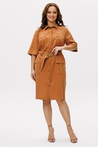 Платье длиной миди комбинированное, свободного кроя, расклешенное к низу. Перед состоит из центральной и боковой части. Спинка с притачной кокеткой, центральной и боковыми частями. На переде и спинке по линии талии настрочена кулиска, с регулировкой прилегания с помощью шнура. Рукав втачно одношовный короткий. Горловина изделия круглой формы.