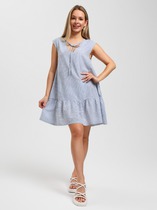 Платье женское, приталенного силуэта, выполнено из сетки-гофре с нитью «люрекс». Модель на трикотажной подкладке, без застежки и плечевых накладок. Платье отрезное по линии талии, с полуприлегающим лифом и расширенной к низу юбкой; для лучшего прилегания в области талии на внутренний шов настрочена узкая эластичная лента. Перед дополнен задрапированным поясом с перекрутом, концы которого входят в боковые швы. По плечевым швам, горловине и подрезу талии – сборка. Горловина округлая, окантована узкой косой бейкой из основного материала. Рукав короткий, расширенный, с фигурным низом, переходящим в разрез, края которого по окату скреплены на запах. Длина платья (от горловины спинки) – 131 см, длина платья (от талии спинки) – 92 см; длина рукава – 30 см.