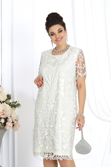Платье женское, полуприлегающего силуэта, выполнено из гипюра и плательной ткани «сатин». Перед и спинка состоят из двух разных по длине слоев: нижний короче верхнего на 5 см. Модель без подкладки, с плечевыми накладками. Низ платья и рукавов оформлен фестонами. Перед в верхнем и нижнем слоях с нагрудными вытачками, выходящими из пройм. Спинка с талиевыми вытачками и средним швом, в верхней части которого обработана застежка на потайную тесьму-«молнию» (50см), в нижней – разрез.  Вырез горловины переда и спинки округлый, углубленный по переду. Рукав короткий, втачной. Верхний и нижний слои платья скреплены по среднему шву, плечевым и проймам. Длина платья (верхний слой)-108 см, длина рукава-26 см.