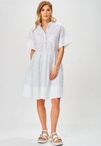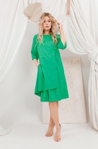 Платье женское, полуприлегающего силуэта, выполнено из гипюра и плательной ткани «сатин». Перед и спинка состоят из двух разных по длине слоев: нижний короче верхнего на 5 см. Модель без подкладки, с плечевыми накладками. Низ платья и рукавов оформлен фестонами. Перед в верхнем и нижнем слоях с нагрудными вытачками, выходящими из пройм. Спинка с талиевыми вытачками и средним швом, в верхней части которого обработана застежка на потайную тесьму-«молнию» (50см), в нижней – разрез. Вырез горловины переда и спинки округлый, углубленный по переду. Рукав короткий, втачной. Верхний и нижний слои платья скреплены по среднему шву, плечевым и проймам. Длина платья (верхний слой)-108 см, длина рукава-26 см.