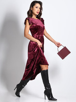 Платье женское полуприлегающего силуэта, выполнено из трикотажного полотна с фактурной лицевой стороной «люрекс». Модель на трикотажной подкладке, с плечевыми накладками. В левом боковом шве расположена застежка на потайную тесьму-«молнию» (35 см). Перед платья со смещенным к боковому шву рельефом, идущим от проймы до низа; в нижней части рельефа обработан разрез. Левая часть переда отрезная по линии талии, с односторонними горизонтальными складками, направленными от рельефа к центру. Спинка с талиевыми вытачками. Горловина спинки округлая, по переду V-образная, углубленная. Рукав короткий, втачной, формы «крылышко на запах», со скругленными срезами. Платье дополнено съемным «цветком» из основного полотна. Длина платья - 136 см; длина рукава - 34 см.