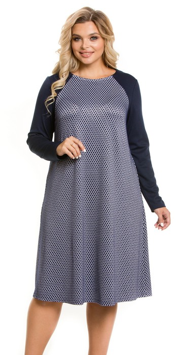 Повседневное платье А-силуэта, выполнено из эластичного трикотажного полотна. Платье по переду и спинке с притачными фигурными кокетками. Спинка со средним швом. В среднем шве застежка на потайной замок-молнию, длиной 20 см. Овальный вырез горловины обработан обтачками. Рукав втачной длинный, слегка зауженный к низу. Длина рукава от плечевой точки в 48 р-ре – 60 см. в 54 р-ре – 61 см., ширина рукава по низу в 48 р-ре – 20 см. в 54 р-ре – 22 см. Фигурные кокетки и рукава выполнены из ткани отделочного цвета. Платье без подклада, в комплекте с поясом-рулик. Длина изделия по спинке в 48 р-ре – 100 см. в 54 р-ре – 104 см.
