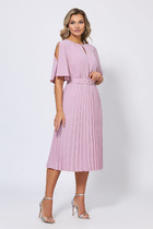 Нарядное платье прямого силуэта выполнено из легкой ткани со струящимся эффектом. Перед и спинка целые. Перед с двумя нагрудными вытачками. Горловина платья в форме лодочка обработана обтачками. Оригинальный втачной рукав с мягкими складками по среднему шву выполнен из органзы с напылением. Рукав свободный, низ рукава ассиметричный. Длина рукава от плечевой точки в 48 р-ре – 55 см. в 58 р-ре – 57 см., ширина рукава по низу в 48 р-ре – 40 см. в 58 р-ре – 46 см. Платье без подклада и застежек. Длина изделия по спинке в 48 – 98 см. в 58 р-ре – 104 см.