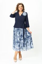 Элегантное платье полуприлегающего силуэта, выполнено из эластичного трикотажного полотна. Перед и спинка платья с рельефными швами. Глубокий V-образный вырез горловины переда с эффектом запаха. Эффект запаха дополняет драпировка по рельефному шву на уровне линии талии. Горловина переда и спинки обработаны обтачками. Рукав втачной короткий. Длина рукава от плечевой точки в 48 р-ре – 17 см. в 58 р-ре – 19 см., ширина рукава по низу в 48 р-ре – 38 см. в 58 р-ре – 44 см. Платье без застежек и подклада. Длина изделия по спинке в 48 р-ре – 100 см. в 58 р-ре – 105 см.