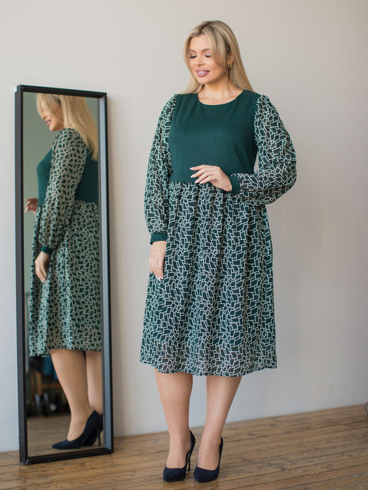 Эффектное платье свободного силуэта, выполнено в сочетании 2-х видов ткани. Платье с отрезной, слегка завышенной линией талии и отлетной складной по шву притачивания. Верх платья выполнен из трикотажного полотна. По переду две нагрудные вытачки, спинка целая. Круглый вырез горловины переда и горловина спинки обработаны обтачками. Низ платья выполнен из шифона с имитацией страз. Перед юбки целый, спинка со средним швом. Пышность юбке придает сборка по шву притачивания линии талии. Юбка на подкладе. Свободный втачной рукав, выполнен из шифона с притачным манжетом по низу. По окату рукава и шву притачивания манжета сборка. Манжеты выполнены из трикотажного полотна. Длина рукава от плеча в 46 р-ре – 61 см. в 64 р-ре – 66 см., ширина рукава по низу в 46 р-ре – 18 см. в 64 р-ре – 24 см. Платье без застежек. Длина изделия по спинке в 46 р-ре – 111 см. в 64 р-ре – 118 см.