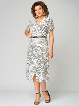 Повседневное молодежное платье прямого силуэта, выполнено в сочетании 2-х видов трикотажного полотна. В швах фигурных подрезов переда расположены удобные карманы. По левой стороне переда нагрудный накладной карман с застежкой на металлический замок-молнию. Овальный вырез горловины переда с узкой притачной планкой. Горловина спинки обработана обтачкой. Спинка целая. Платье с удлиненной линией плеча и заниженной проймой. Рукав длиной 3/4 зауженный к низу. Длина рукава от горловины в 48 р-ре – 52 см. в 58 р-ре – 54 см., обхват рукава по низу в 48 р-ре – 26 см. в 58 р-ре – 32 см. Платье с притачным низом по переду и спинке с разрезами в боковых швах, длина разреза 10 см. Притачной низ платья и рукава выполнены из ткани компаньона. Платье без подклада и застежек. Длина изделия по спинке в 48 р-ре – 96 см. в 58 р-ре – 101 см.