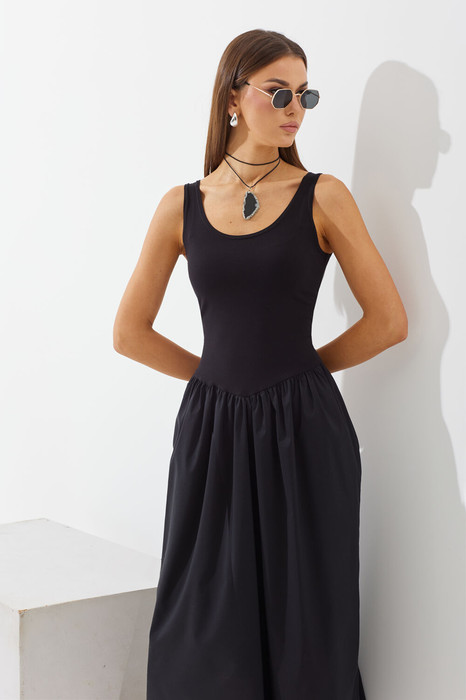 Платье женское комбинированное, выполнено из двух видов ткани (хлопка текстильного и хлопка трикотажного). Верхняя часть платья имитирует майку, а снизу юбка со сборкой по талии. Подрез по талии сзади – горизонтальный, спереди – под углом. Горловина округлой формы, без рукава. Длина платья «мидакси».