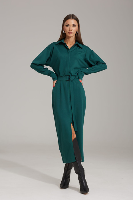 Платье полуприлегающего силуэта, со спущенным плечом, выполнено из трикотажного полотна, отрезное по талии. Верхняя часть переда и спинки более свободной формы. На переде расположена потайная планка на петли-пуговицы до подрезной линии. На левой детали переда в области груди расположена прорезная листочка – обманка. Воротник стояче-отложной с отрезной стойкой. В верхней части переда и спинки заложены односторонние складки, направленные к боковому шву. В нижней части переда расположен переходящий в разрез средний шов. На талии, по переду и спинке расположены вытачки. К платью прилагается пояс из основной ткани. Отделкой в данной модели служит фурнитура контрастного цвета.