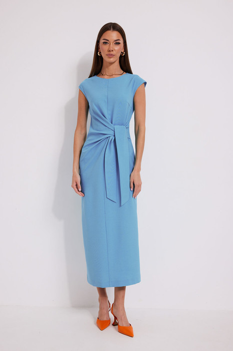 Платье женское, полуприлегающего силуэта, со слегка спущенным плечом. По переду в области талии драпировка, переходящая в завязывающийся пояс. Горловина округлой формы. Спинка со средним швом, в котором сверху потайная молния, снизу разрез, а так же вертикально направленные талиевые вытачки.