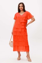 Нарядное платье полуприлегающего силуэта, с дизайнерской отделкой из ткани в паетки. Вырез горловины V-образной формы, отрезные кокетки из отделочной ткани, с бахрамой, имитирующей рукав. Подрез ниже линии бедер из отделочной ткани. Талиевые вытачки. Средний шов по спинке с потайной молнией и разрезом.