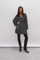 Платье полуприлегающего силуэта, втачного покроя. Выполнено из трикотажного плательного полотна с блеском. Отрезное по линии талии по переду, верхняя часть переда на подкладке. Рукав одношовный короткий. Верхняя часть переда состоит из кокетки и лифа со складками, идущими на «запах» (имитация застежки). Спинка с талиевыми вытачками и средним швом, в котором разрез и застежка на «тесьму-молнию». Платье к низу заужено, горловина «V-образной» формы по переду. Дополнением служит пояс с пряжкой из основной ткани.