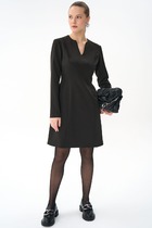 Платье женское полуприлегающего силуэта, втачного покроя рукава, выполнено из костюмной ткани с шифоновыми рукавами с металлизированной нитью. По переду отрезное по линии талии, верхняя часть, верхняя часть на подкладке, состоит из кокетки и лифа со складками, идущими на запах. Горловина «V - образной» формы. Спинка с талиевыми вытачками и средним швом, в котором разрез и застежка на тесьму-молнию. Рукав одношовный, длинный со сборкой по окату и собранный на резинку по низу. Дополнением служит пояс с пряжкой из основной ткани.