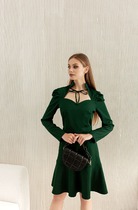 Модель с фигурным подрезом ниже линии талии. В верхней части переда застёжка на пуговицы. Нижняя часть платья со сборкой. В боковых швах высокие разрезы. По низу рукава отложная манжета с петлёй и пуговицей.