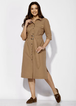 V-образный вырез горловины обработан планкой. Средний шов спинки снизу заканчивается разрезом. Талия подчёркнута съёмным завязывающимся поясом. Платье декорировано брошью.