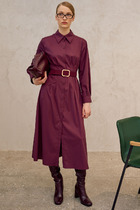 Модель Х-силуэта, с отрезной линией талии, собранной на резину. Спереди планка с застёжкой на петли и пуговицы. Воротник сороччный. По низу рукава разрез, защипы и манжета с застёжкой на петли и пуговицы. Талия подчёркнута съёмным завязывающимся поясом из основной ткани.