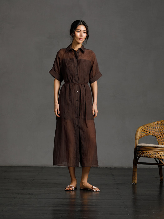 Модель полуприлегающего силуэта, с коротким цельнокроеным рукавом, на частичном подкладе из хлопка. Перед и спинка с кокетками, горизонтальным подрезом и рельефами. Спереди планка с застёжкой на петли и пуговицы. Воротник сорочечный. По низу рукава манжета с отворотом. Талия подчёркнута поясом шнурком.