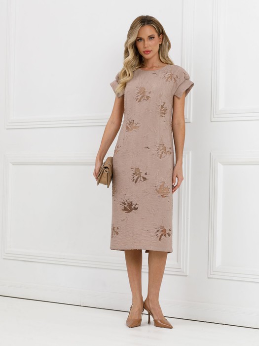 Модель полуприлегающего силуэта, со спущенным плечом, на подкладе. Пройма частично со сборкой, обратотана манжетом. В среднем шве спинки потайная застёжка молния и высокий разрез.