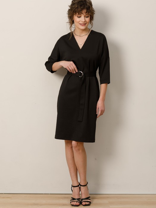 Перед и спинка со средним швом. Талия подчеркнута съемным поясом с полукольцами. Платье декорировано отделочными строчками.