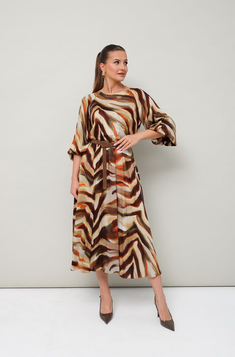 Платье отрезное по линии талии на резинке, выполнено из вискозы с анималистичным принтом. Горловина с окантованным вырезом горловины. Рукава-реглан, в длине 3/4 собраны на резинку по низу. По спинке обработан разрез с застежкой в среднем шве на навесную петлю и пуговицу. В комплекте прилагается съемный ремень.