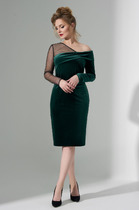 Платье отрезное по линии талии, полуприлегающего кроя, выполнено из плательной струящейся ткани. Горловина с рубашечным воротником на притачной стойке. Лиф с центральной застежкой на потайную планку на петли и пуговицы. По талии обработана резинка для регуляции размера. Юбка с имитацией запаха с застежкой на притачной пояс из основной ткани, который фиксируется на бант. Рукава длинные с притачной манжетой с застежкой на пуговицы.