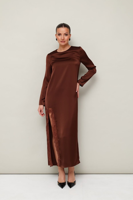 Стильное платье прямого силуэта, выполнено из струящейся ткани с благородным матовым блеском. Округлый вырез горловины. Рукава длинные втачные. Внизу обработан высокий разрез с кружевной отделкой. Застёжка по спинке в среднем шве «капля» на пуговицу и навесную петлю.