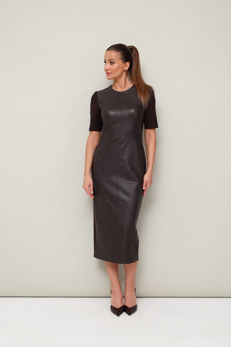 Стильное платье-футляр отрезное по линии талии, выполнено из экокожи и трикотажного полотна. Горловина округлой формы. Короткие втачные рукава. Застёжка по спинке в среднем шве на потайную молнию. Для удобства движения сзади обработан разрез.