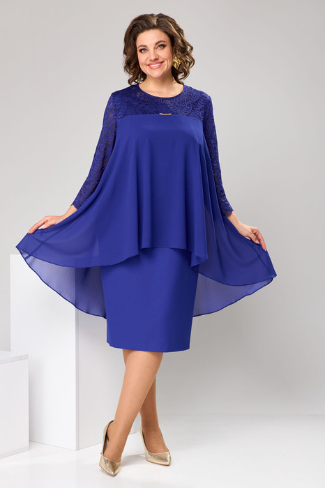 Платье женское полуприлегающего силуэта с отлетной накидкой, длиной за колено относится к нарядной торжественной одежде. Перед с отрезной кокеткой из отделочной ткани, с двумя талиевыми и двумя нагрудными вытачками. Спинка с отрезной кокеткой, с двумя талиевыми вытачками и средним швом, заканчивающимся шлицей. Застежка на потайную тесьму-молнию в левом боковом шве платья. Горловина без воротника, обтачная, с V-образным вырезом по спинке. Рукав длиной 7/8, одношовный из отделочной ткани. Перед декорируется пришивным украшением. Платье с плечевыми накладками. Длина спинки от нижней части выреза горловины 90 см. Длина рукава 49 см. Примечание: кружево мягкое, приятное к телу, совсем не колется