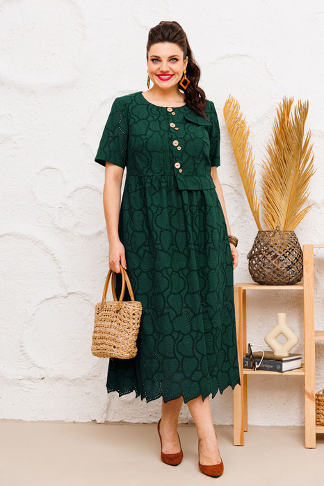 Платье женское отрезное по линии талии, длиной ниже колена, предназначено для повседневной носки. Верхняя часть переда с двумя нагрудными вытачками, с двумя односторонними зафиксированными складками справа, со средним швом с односторонней зафиксированной складкой, с цельнокроеной отлетной баской, с фигурным настрочным клапаном слева. Складка среднего шва декорируется 4-мя большими и 4-мя маленькими декоративными пуговицами. Нижняя часть переда с легкой сборкой по верхнему срезу. Верхняя часть спинки с двумя талиевыми вытачками, верхний срез нижней части спинки с легкой сборкой, расположенной между вытачками верхней части. В боковых швах платья обработаны карманы. Горловина круглая, обтачная, без воротника. Рукав втачной, короткий, одно шовный. Платье на хлопковой подкладке. Платье с плечевыми накладками. Длина спинки 115 см. Длина рукава 28 см