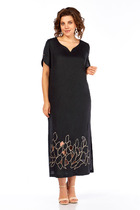 Платье женское относится к нарядной торжественной одежде. Платье полуприлегающего силуэта, с отлетной накидкой длиной за колено. Перед с двумя нагрудными вытачками, с двумя талиевыми вытачками. Спинка с двумя талиевыми вытачками и средним швом, заканчивающимся шлицей. Застежка на потайную тесьму-молнию в среднем шве спинки. Горловина круглая, обтачная, без воротника, по горловине закреплена накидка. Слева на уровне линии талии отделочным хлястиком, декорированным тесьмой накидка закрепляется на платье, нижняя часть накидки закреплена в левом боковом шве. Накидка с фигурным низом. Платье без рукавов. Длина спинки 103 см. Длина накидки от горловины 38 см