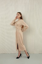 Платье женское относится к нарядной торжественной одежде. Платье полуприлегающего силуэта, с отлетной накидкой длиной за колено. Перед с двумя нагрудными вытачками, с двумя талиевыми вытачками. Спинка с двумя талиевыми вытачками и средним швом, заканчивающимся шлицей. Застежка на потайную тесьму-молнию в среднем шве спинки. Горловина круглая, обтачная, без воротника, по горловине закреплена накидка. Слева на уровне линии талии отделочным хлястиком, декорированным тесьмой накидка закрепляется на платье, нижняя часть накидки закреплена в левом боковом шве. Накидка с фигурным низом. Платье без рукавов. Длина спинки 103 см. Длина накидки от горловины 38 см